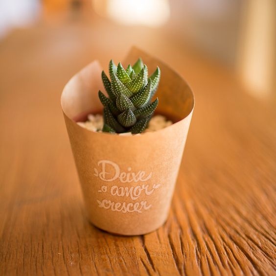 Nos últimos tempos foram realizados nos nos casos, especialmente nos de estilo rústico. Presentear os convidados com um pequeno vaso de suculentas, cactos ou outras plantinhas do agrado dos noivos, podem ser uma bela representação da ideia de amor, e este é um ser cultivado com carinho para crescer sempre lindo e saudável.